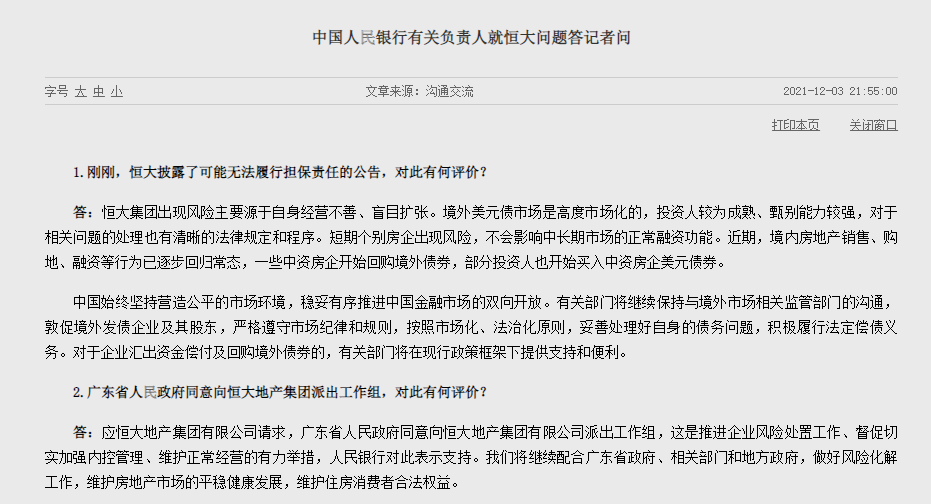 在上一個工作日的晚上,也就是恒大違約公告的當(dāng)晚,央行官網(wǎng)就專門發(fā)布了央行有關(guān)負責(zé)人對恒大問題的看法,并明確提到: