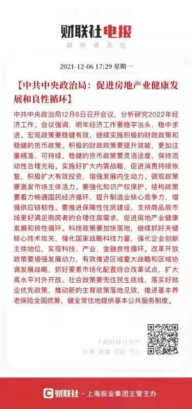 今天中央 ZZ 局召開會議,分析研究2022年經(jīng)濟工作。會議強調(diào),要推進保障性住房建設(shè),支持商品房市場更好滿足購房者的合理住房需求,促進房地產(chǎn)業(yè)健康發(fā)展和良性循環(huán)。