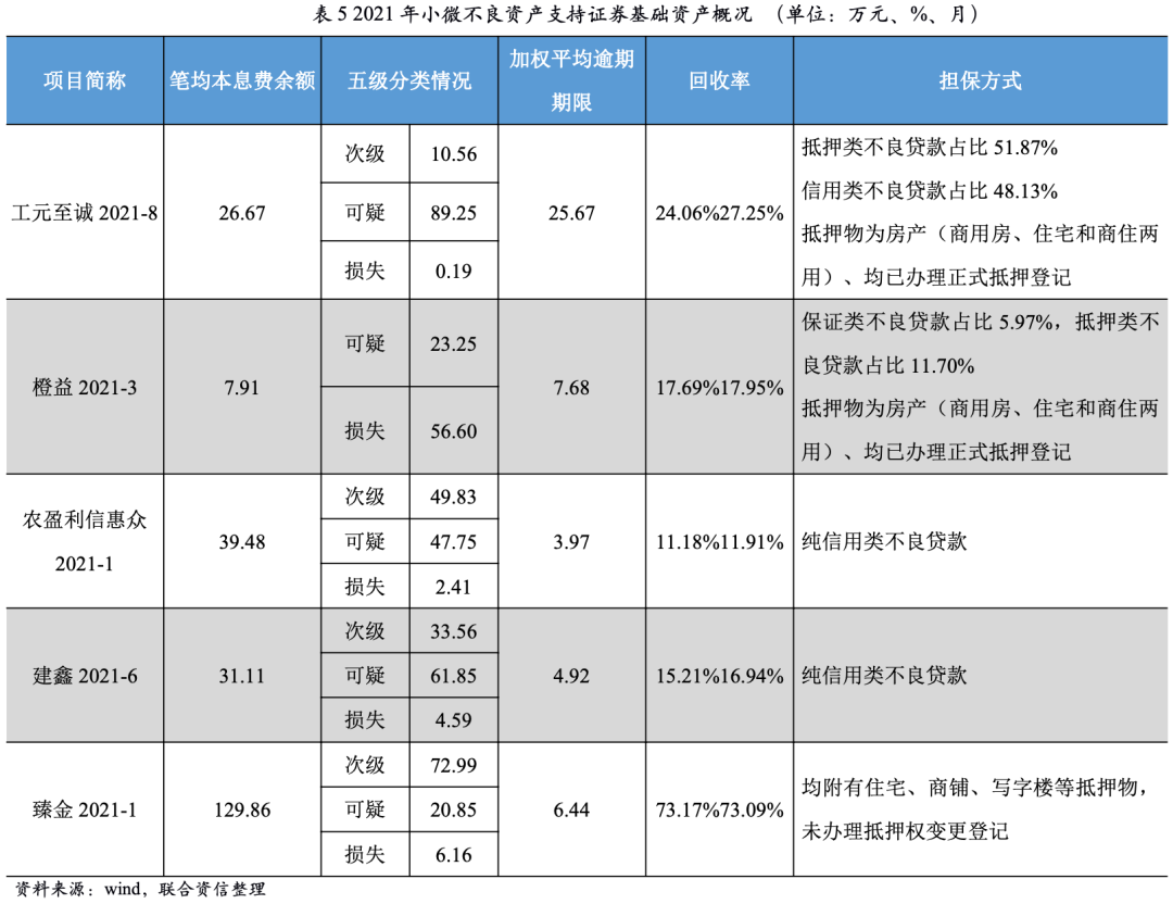 2021年,共發行5單小微不良資產支持證券,證券發行規模6.79億元,僅占總發行規模的2.26%,基礎資產未償本息費余額36.88億元。從擔保方式來看,基礎資產涉及的擔保方式較為多樣,包括抵押、保證、質押等多種擔保方式,抵押物多以不動產為主。入池不良資產貸款單筆平均本息費余額分布在7.91萬元-129.86萬元,筆均本息費余額波動較大,入池資產同質性較低?;A資產附帶的抵押物的表現能力對回收估值水平影響較大,入池資產均附帶抵押物的小微NPL產品回收率達70%多,純信用類小微不良貸款回收率在10%-20%。