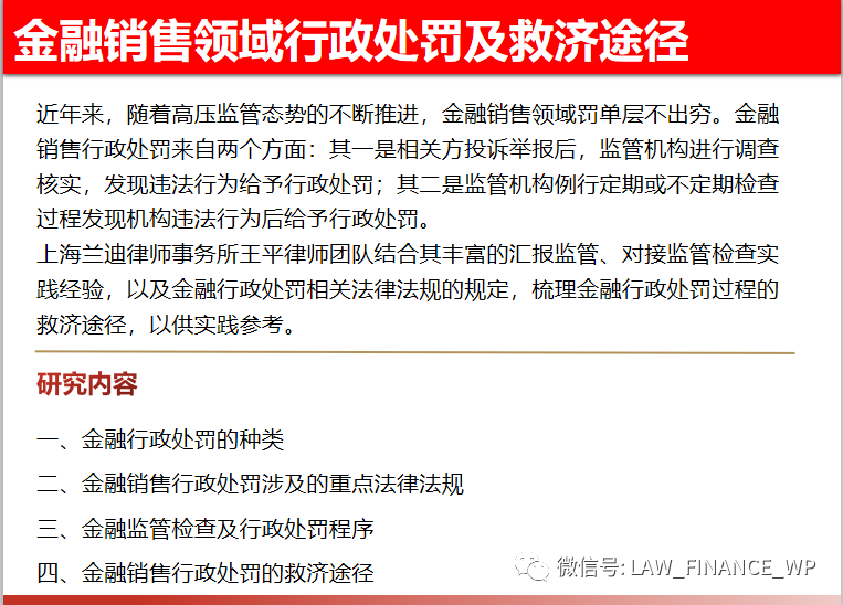 近年來,隨著高壓監管態勢的不斷推進,金融銷售領域罰單層不出窮。金融銷售行政處罰來自兩個方面:其一是相關方投訴舉報后,監管機構進行調查核實,發現違法行為給予行政處罰;其二是監管機構例行定期或不定期檢查過程發現機構違法行為后給予行政處罰。行政處罰的救濟途徑包括檢查期間溝通、聽證程序、行政復議及行政訴訟,每個階段有各種特點,進而也有對應的溝通技巧。本次研究報告的內容如下: