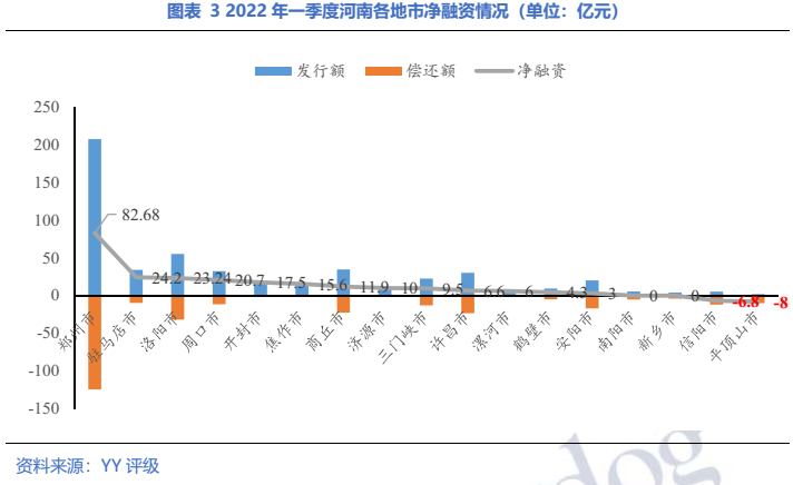 從省內(nèi)各地級市2022年一季度凈融資情況來看,17個地級市分化明顯。省會鄭州凈融資額領(lǐng)先于其他地市,Q1實現(xiàn)凈融資82.68億,占全省的34.4%,相較于去年同期(-47.79億元)增長明顯。駐馬店、洛陽、周口、開封、焦作、商丘、濟源處于第二梯隊,凈融資額在10億元以上。三門峽、許昌、漯河、鶴壁、安陽處于第三梯隊,凈融資額為正但均在10億元以下。南陽、新鄉(xiāng)兩市新發(fā)行與償還額持平,而信陽、平頂山市凈融資為負,處于第四梯隊。
