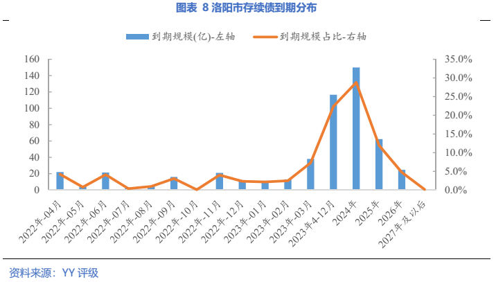 細分到地級市來看:截至2022年3月末(下同)鄭州市存續(xù)債1,353.96億元,其中一年內(nèi)到期金額為430.4億元,占比為31.79%,下圖來看,每個月償還的絕對數(shù)額不大;另外洛陽市2023年底前到期的債券占比超過23.1%,償債壓力較為集中。