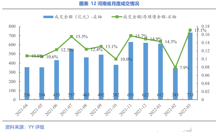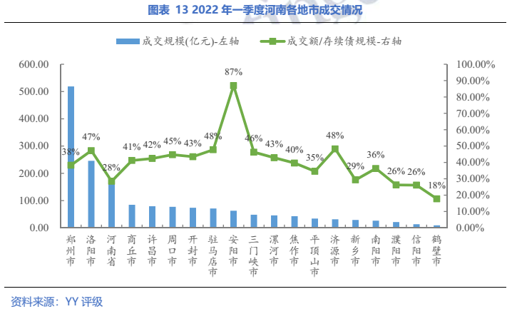 分地級市來看,成交規(guī)模方面,排序與存續(xù)債體量有一定相關(guān)性;從成交金額/存續(xù)債余額來看,安陽、駐馬店、濟源和洛陽的成交更為活躍,另外,鶴壁的成交活躍度最低。