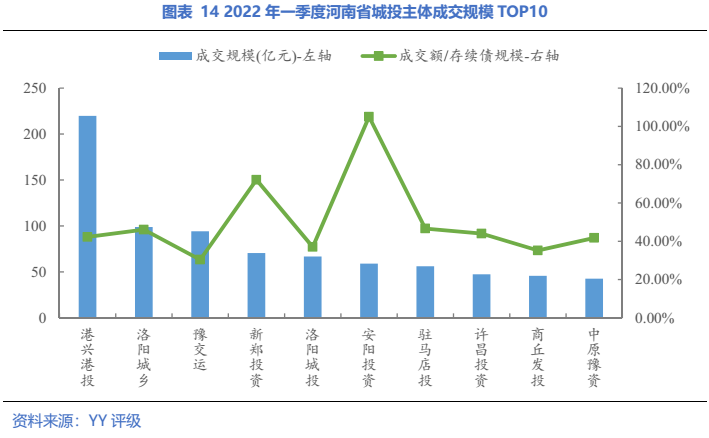具體到主體層面,2022年一季度成交規(guī)模最大的主體是港興港投;從成交金額/存續(xù)債余額來看,成交額前10的主體中,安陽投資的成交最為活躍,豫交運的成交活躍度最低。