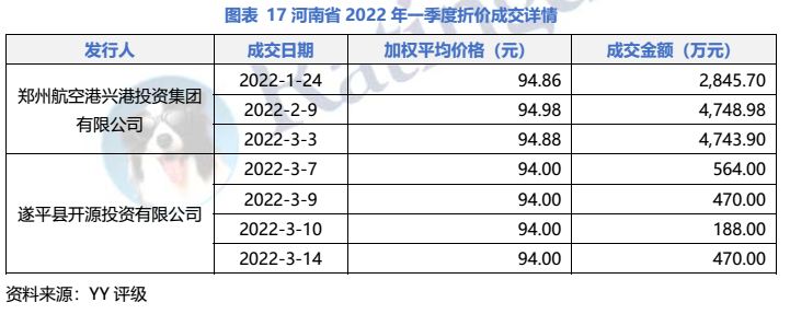 具體到主體,22年一季度河南省發(fā)生折價成交的平臺包括鄭州航空港興港投資集團有限公司(YY5-)和遂平縣開源投資有限公司(YY8),分別為鄭州市和駐馬店市的平臺。河南省近一年的折價成交主要發(fā)生在鄭州航空港興港投資集團中。