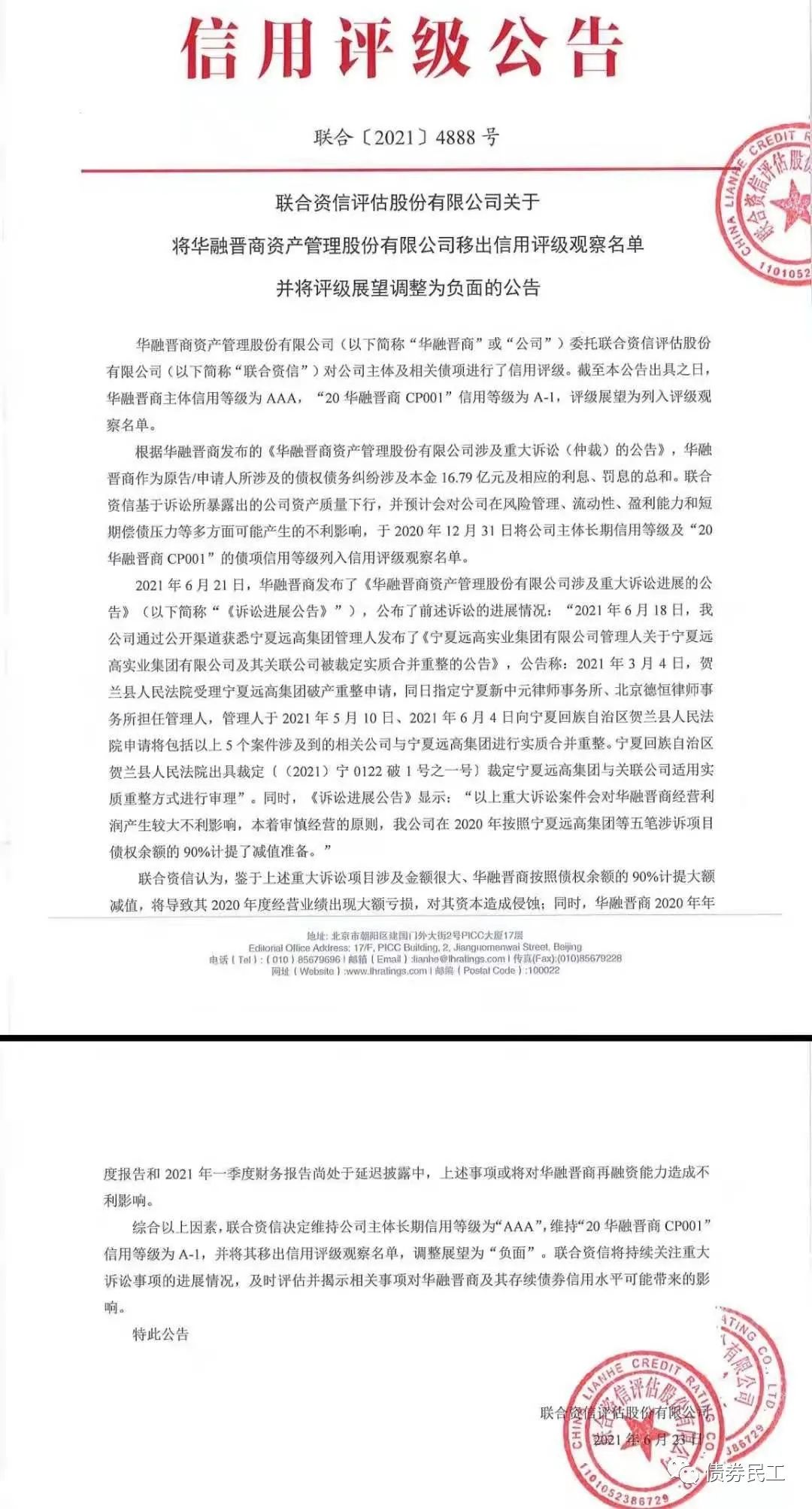 根據(jù)聯(lián)合資信2021年6月23日出具的評(píng)級(jí)報(bào)告,華融晉商資產(chǎn)管理股份有限公司(以下簡(jiǎn)稱“華融晉商”)的評(píng)級(jí)展望調(diào)整為負(fù)面!此次調(diào)整的主要原因是公司涉及16.79億元的重大訴訟。根據(jù)華融晉商2021年6月21日的公告,寧夏遠(yuǎn)高集團(tuán)已經(jīng)開被裁定實(shí)質(zhì)合并重整,公司在2020年對(duì)寧夏遠(yuǎn)高集團(tuán)等5筆訴訟債權(quán)按照債權(quán)余額的90%計(jì)提了減值準(zhǔn)備。