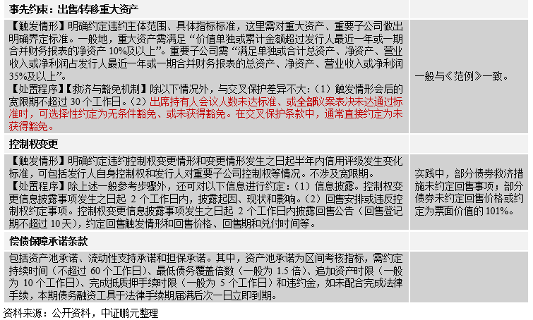 交叉保護相對于其他條款對發行人的約束力更強,主要體現在,第一,和一般債券的違約情形相比,相當于擴大了違約債務的覆蓋范圍。第二,救濟措施給予的寬限期上限短于其他條款,且與約定債務的寬限期有關。另外,交叉保護條款一般約定寬限期內完成觸發情形中債務的足額償還,則不作為實質性交叉違約。通常發行人此時償還能力極為有限,其能做的最好的情況是對觸發情形中債務進行展期,從既有案例看,展期將不會觸發其他債券的交叉保護條款。第三,決議表決生效條件更嚴格。交叉保護、事先約束和事先承諾均涉及召開持有人會議商議豁免議案,但后兩者在出席持有人會議人數未達標準、或表決全部議案未達通過標準時,可選擇性約定為無條件豁免、或未獲得豁免。在交叉保護條款中,通常直接約定為未獲得豁免。此外,與其他條款不同,償債保障承諾條款更傾向于發行人在約定期內做出糾正和行為履行,與債務償還能力直接相關。在資產池承諾項下,如未及時作出糾正,債務無需經持有人會議直接提前到期,而違反流動性支持和擔保承諾不會導致債務到期,僅涉及違約金支付。從這個角度看,資產池承諾成為交叉保護條款后的另一大約束性條款。