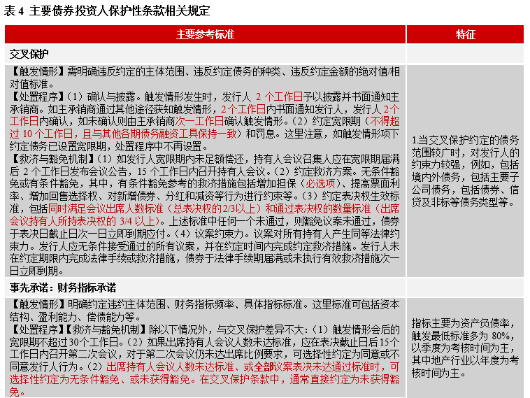 保護性條款的特征:(1)特征:第一,不同條款的保護力度有所差異,其中交叉保護相對于其他條款對發行人的約束力更強,資產池承諾成為交叉保護條款后的另一大約束性條款。第二,保護性條款,將差異化持有人會議及議案的生效條件。通常,銀行間品種對保護性條款的決議生效做單獨約定。第三,非標準化的保護性條款或加強投資者保護。部分債券雖未約定特殊保護性條款,但在違約情形中做出相關約定。這里需要注意,違約情形和保護性條款中約定的觸發情形、違約處置和救濟措施的差異。(2)保護性條款應用中存在的問題。第一,部分債券對保護性條款等的約定不夠清晰。第二,持有人會議議事效率不高。第三,多次觸發保護性條款,反復召開持有人會議。第四,債券提前到期的時間存在不確定性。