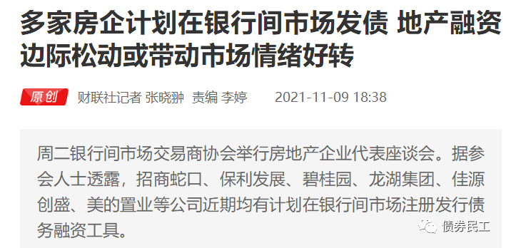 此次三家房地產公司新增住注冊債務融資工具額度,應該是交易所協會最新監管政策的直接反饋。根據財聯社2021年11月10日的消息,交易商協會舉行了房地產企業代表座談會,此后多家房地產公司計劃發行債務融資工具產品。