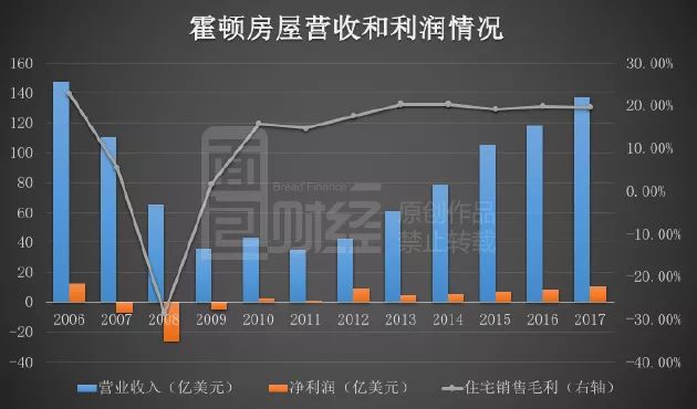 經(jīng)歷2008年金融危機(jī)后,霍頓房屋從2010年開始恢復(fù)盈利,而營收則從2012年開始進(jìn)入增長通道,2017財(cái)年總營收為137.42億美元,與2006財(cái)年的歷史高點(diǎn)147.61億美元已十分接近。