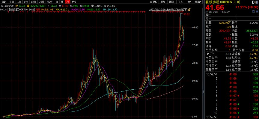 霍頓房屋于1992年登陸紐交所,隨后開始不斷擴(kuò)大業(yè)務(wù)規(guī)模。目前,霍頓在美國26個(gè)州的79個(gè)市場開展業(yè)務(wù)。從2002年開始,連續(xù)16年為全美銷量第一的開發(fā)商。感受下霍頓房屋的股價(jià)走勢(shì):