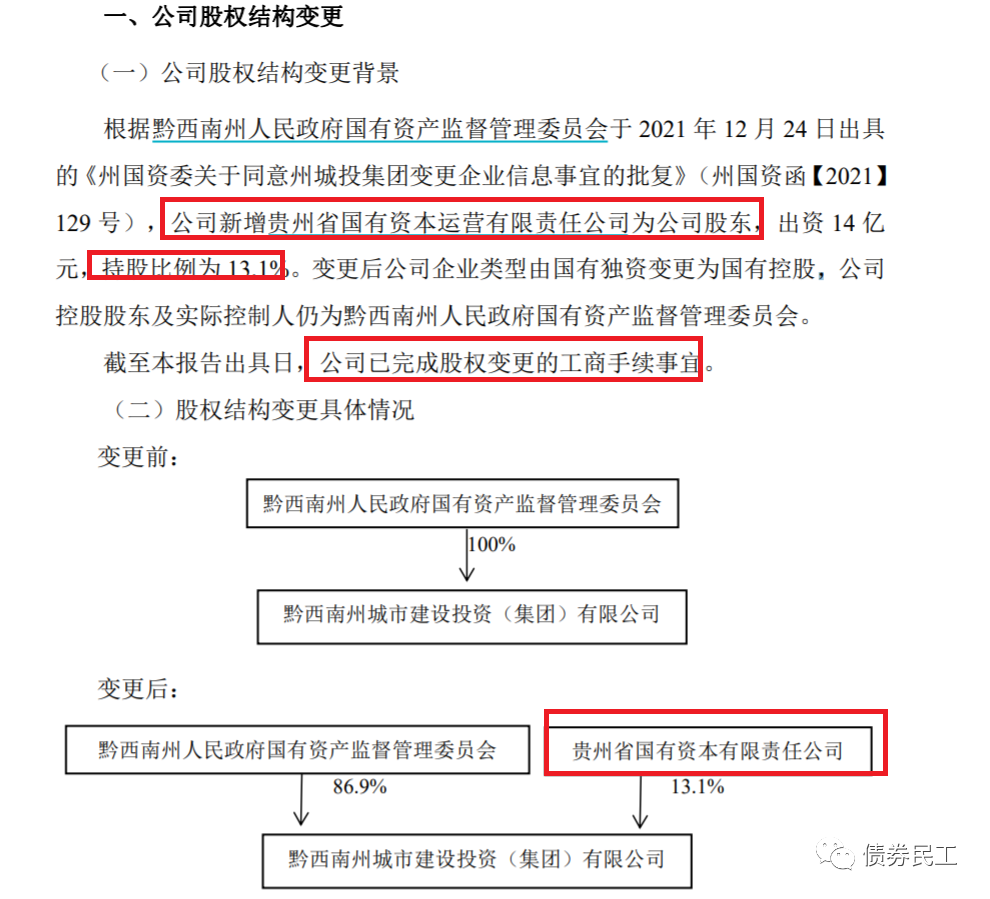 根據(jù)黔西南州城市建設(shè)投資(集團(tuán))有限公司(以下簡(jiǎn)稱(chēng)“黔西南城投”)2022年1月5日的公告,貴州省國(guó)有資本運(yùn)營(yíng)有限責(zé)任公司出資14億元,成為持有公司13.1%股權(quán)的股東。黔西南城投的實(shí)際控制人未發(fā)生變更,仍然是黔西南州國(guó)資委,目前已完成了股權(quán)變更工商手續(xù)。黔西南城投的主體信用等級(jí)為中誠(chéng)信國(guó)際AA。