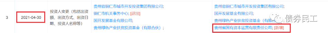 2、2021年4月30日,貴州國(guó)資公司成為銅仁市水務(wù)投資有限責(zé)任公司(中誠(chéng)信國(guó)際和聯(lián)合資信主體信用等級(jí)AA,實(shí)際控制人銅仁市國(guó)有資產(chǎn)管理局)持股比例為17.41026%的股東。