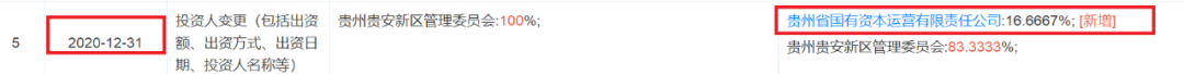 1、2020年12月31日,貴州國(guó)資公司成為貴安新區(qū)產(chǎn)業(yè)發(fā)展控股集團(tuán)有限公司(中誠(chéng)信國(guó)際主體信用等級(jí)AA,實(shí)際控制人貴安新區(qū)管委會(huì))持股比例為16.6667%的股東。