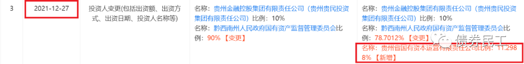 4、2021年12月27日,貴州國(guó)資公司成為黔西南州水資源開(kāi)發(fā)投資有限公司(實(shí)際控制人黔西南州國(guó)資委)持股比例為11.2988%的股東。