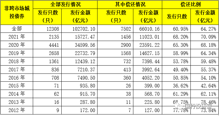 1、截至2021年4月19日,全部12308只未跨市場發(fā)行的城投債中,有7502只的資金用途為償還存量債務、占比達到60.95% 這10.27萬億的未跨市場發(fā)行的城投債中,有6.60萬億的資金用途為償還存量債務、占比達到64.27%。