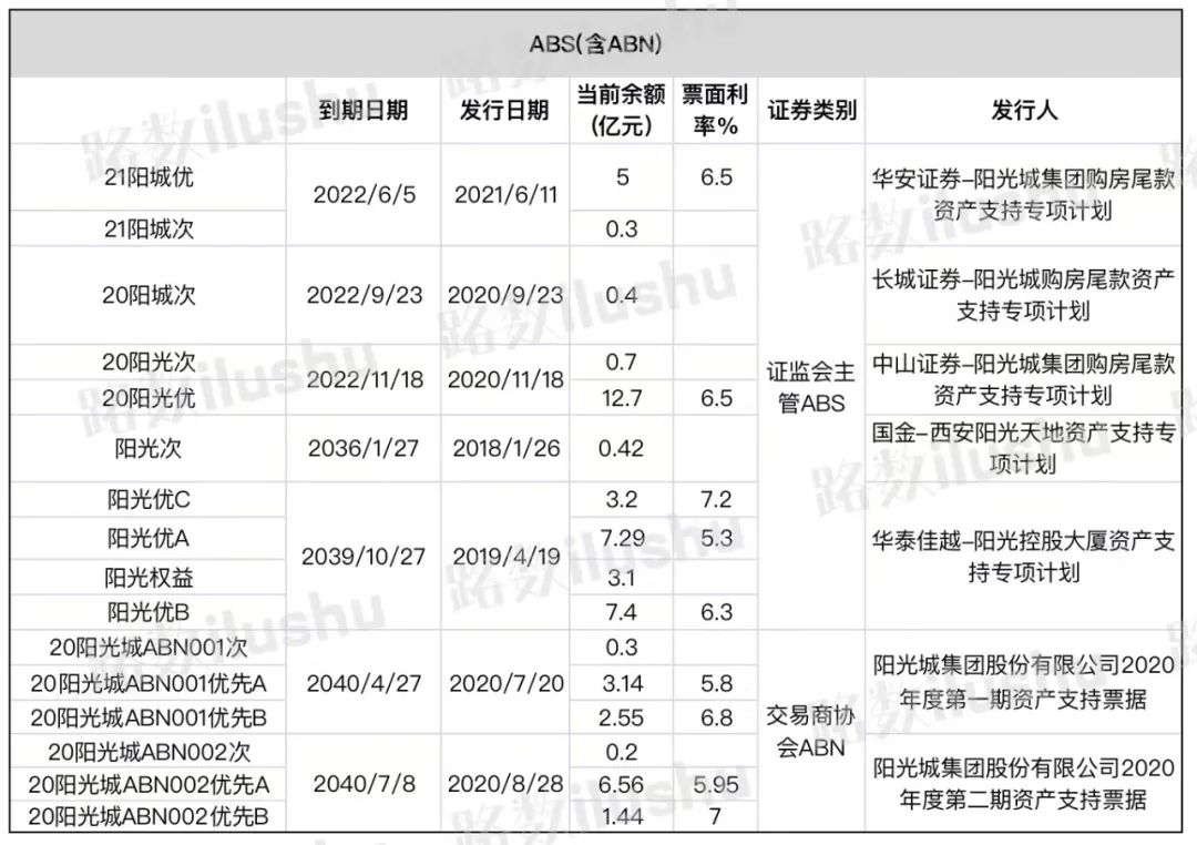其中有:一只由“中山證券-陽光城集團購房尾款資產(chǎn)支持專項計劃”發(fā)起的ABS產(chǎn)品“20陽光優(yōu)”,回售到期。一筆為美元債“陽光城10% N20230212“,也是回售到期。另外還有一筆境內(nèi)債“18陽光04”和一筆供應(yīng)鏈。