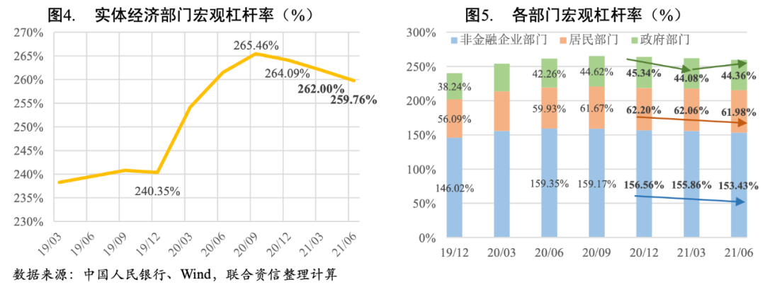 2021年上半年,貨幣政策基本回歸常態,在信用擴張放緩和名義GDP增長提速的共同作用下,我國實體經濟部門杠桿率逐季下降,非金融企業部門降杠桿貢獻最大。