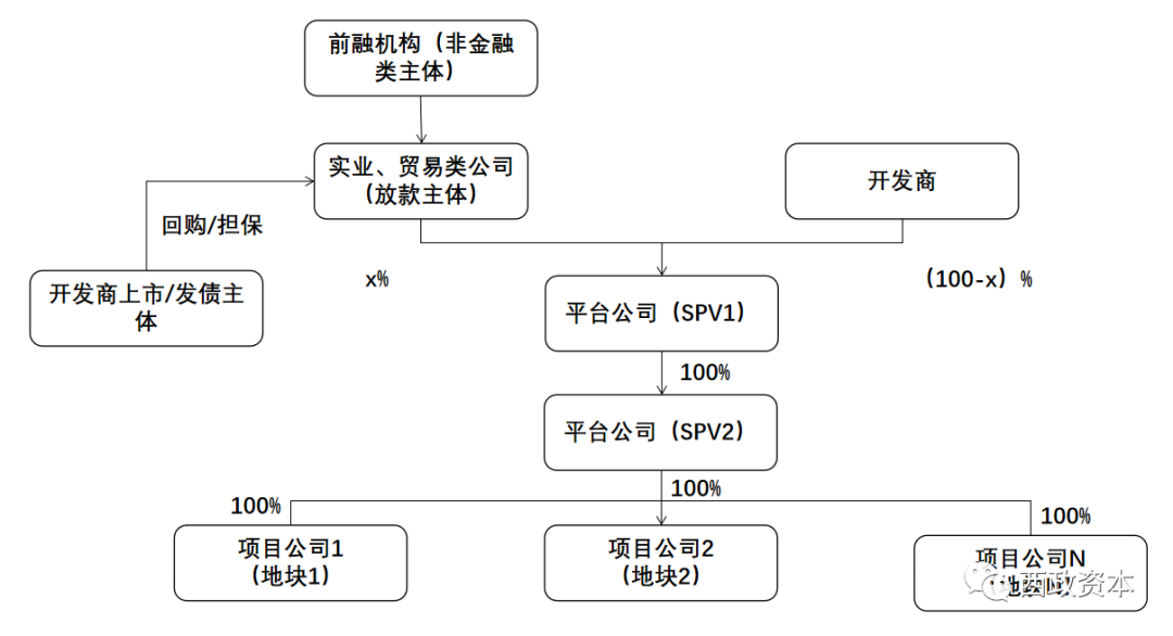 1. 前融機構指定實業、貿易類放款主體,由該放款主體與開發商共同出資設立平臺公司(SPV1),雙方同時確定持股比例與配資比例,平臺公司承載土地保證金的資金池。