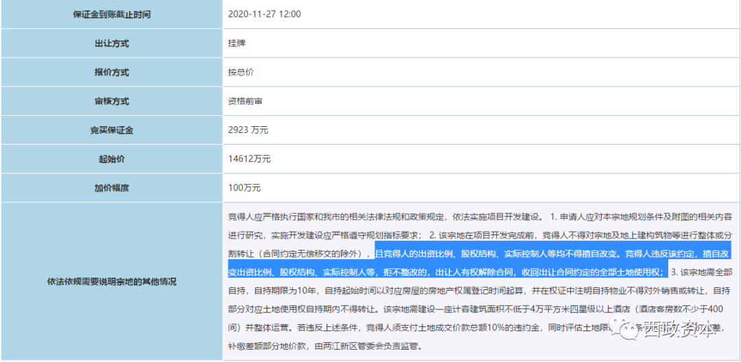 根據上述土地競拍方的資金需全部為自有資金的要求,監管部門為了有效打擊開發商高杠桿融資拿地或倒賣土地的行為,目前有不少城市都已在招拍掛文件中對項目公司競得土地后的股權變更做出明確的限制性規定。以下為重慶市和紹興市土地出讓的相關限制性要求示例: