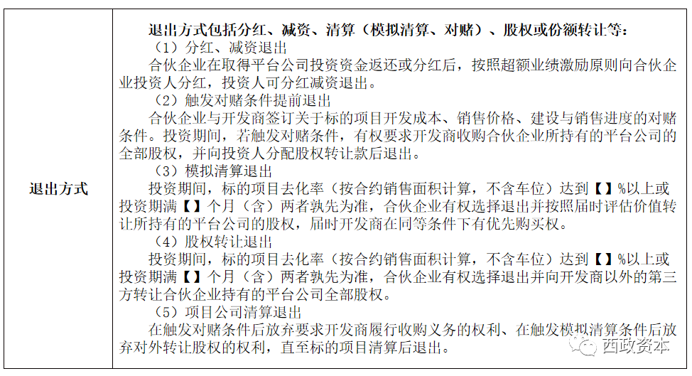 7. 退出方式:分紅、減資退出;觸發模擬清算退出;轉讓平臺公司股權退出;觸發對賭條件退出;項目公司實際清算退出。