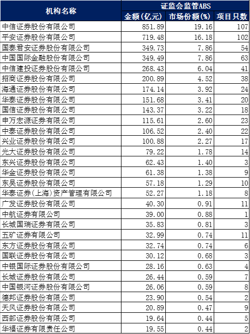 2022年1-7月份,證監會主管ABS承銷排名靠前的機構分別為中信證券、平安證券、國泰君安、中金公司和中信建投,承銷金額分別為851.89億元、719.48億元、349.73億元、349.49億元和268.43億元。前五大、前十大和前二十大承銷商市場份額占比分別為57.09%、74.76%和89.04%。