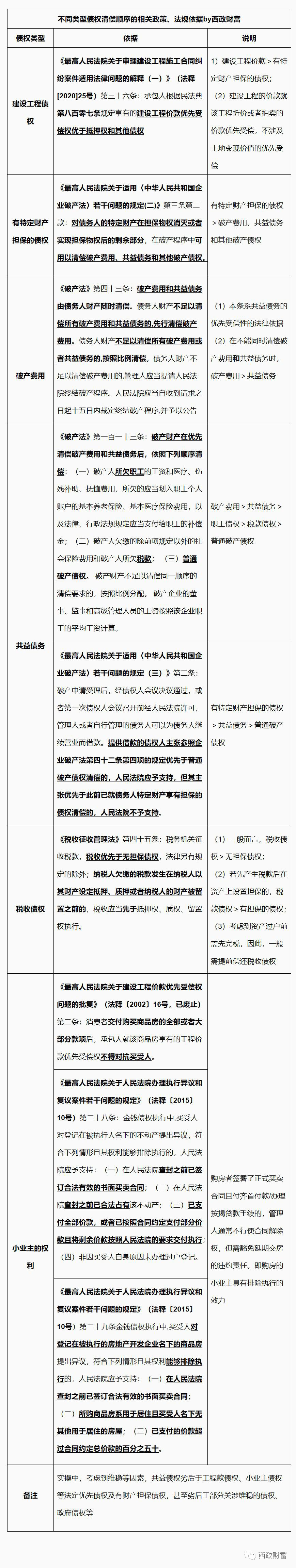 從法律規定上,各類債權在破產程序中的清償順位為:預售后小業主的權利>建設工程款債權>有特定財產擔保的債權>破產費用>共益債務>職工債權>稅款債權>普通債權。但是在房地產的破產案件實踐中,考慮到項目的竣工驗收以及設計、監理、供應商等配合等因素,諸如政府規費、配套費等普通債權以及設計、監理以及供應商等債權通常亦會優先于共益債務償還;由于完稅后才能進行資產過戶,所以,稅收債權一般也需提前償還;再如,涉及到生存保障以及維穩等因素,職工債權以及與民生相關的一些小額債權亦會全額、優先償付。