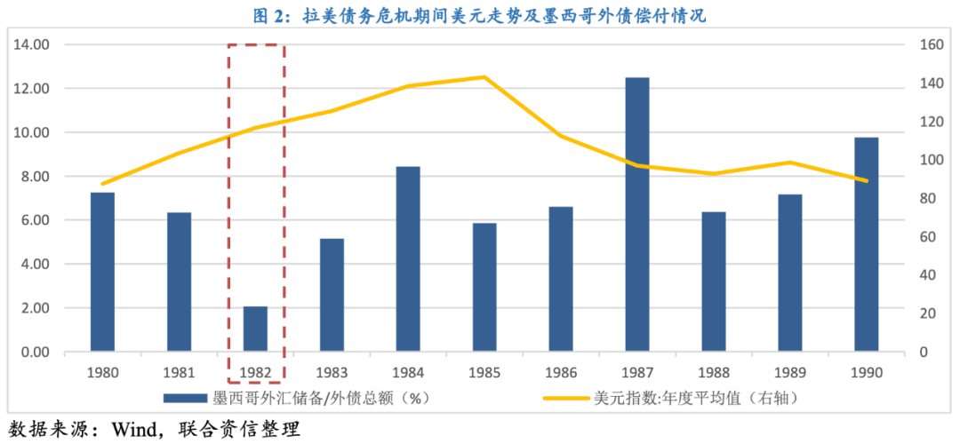 隨著美聯儲加息進程的推進,外債借入國的貨幣面臨較大的貶值壓力,本幣貶值雖然有利于出口,但會增加外債償還壓力以及發生貨幣危機和債務危機的概率。比如20世紀70-80年代,拉美國家正處于經濟起步階段,但由于國內銀行儲蓄水平較低,掣肘政府和企業的投資規模并限制其資本積累,因此拉美國家多采取對外舉債的方式來發展本國經濟,歐美國家商業銀行貸款利率較低且實際利率甚至為負,促使墨西哥、阿根廷以及巴西等拉美國家借入大量以美元計價的政府債務。兩次石油危機爆發促使美聯儲貨幣政策由寬松轉為緊縮,由于拉美國家的借貸利率是以3個月或6個月LIBOR為基礎調整,當利率陡然上升后利息償付壓力大幅提高,墨西哥外匯儲備對外債總額的保障能力僅為2.1%(1982年),再加上美元走強以及墨西哥比索貶值,1982年墨西哥發生主權外債違約,隨后巴西、委內瑞拉、阿根廷、秘魯和智利等國也相繼爆發債務危機。