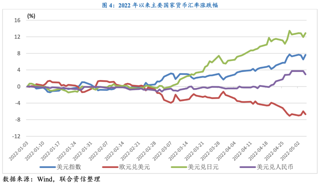 從匯率波動情況看,本輪美聯儲加息對匯率市場的影響逐步顯現,截至2022年3月末,美元的供應量為21.9萬億美元,本次美聯儲上調聯儲基金利率50個BP,相應帶動再貼現率走高;由于貨幣乘數與再貼現率呈反比,貨幣乘數隨之下降,預計5月末市場上的美元供應量將下降至21萬億美元左右,繼續帶動美元走強。5月4日,美元指數一度逼近104關鍵點位,創近20年以來新高。在美元指數走強的背景下,歐元、日元以及人民幣等主要貨幣匯率卻紛紛走跌。歐元方面,歐元區經濟表現不佳,同時俄羅斯宣布對歐洲兩國禁運天然氣,表明俄羅斯和歐盟地區的緊張關系再度加劇,歐洲地區面臨的經濟增長放緩壓力和地緣政治風險均有所提升,導致歐元承壓下行,5月5日歐元兌美元收于1.0542,創2017年以來新低。日元方面,由于日本央行繼續維持超寬松的貨幣政策,日美貨幣政策分化導致日元進一步承壓下行,5月5日美元兌日元突破130關口,創近20年以來新高。人民幣方面,人民幣自美聯儲緊縮升溫以來呈現波動走軟態勢,再加上3月國內停工停產對出口有所影響以及俄烏沖突背景下外部需求有所走弱,供需兩端承壓對人民幣走勢有所拖累,此外中美貨幣政策分化走勢的繼續加大導致外資回流美國,進一步令人民幣承壓,5月6日離、在岸人民幣匯率雙雙跌破6.65的重要點位。