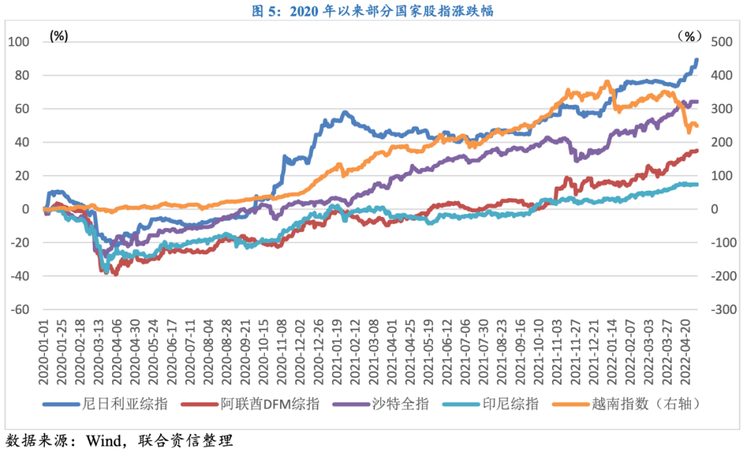 本次美聯儲加息下的國際資本流動具有一些新特征,受歐洲地緣政治風險猶存、日本經濟政策維持相對寬松以及中國疫情防控升級加劇供應鏈緊張等因素影響,國際資本轉而流向“資源導向型”以及“雁陣模式升級型”國家。一方面,俄烏沖突爆發加劇了全球糧食危機、能源供應短缺以及全球供應鏈緊張,“資源導向型國家”憑借自身資源充足的稟賦優勢對俄烏沖突風險形成有效緩沖,因此吸引了大量國際避險資本流入。根據國際貨幣基金組織(IMF)預測數據,高油價將有望推動沙特經濟邁入高速增長模式,3月沙特石油產量增至約1,030萬桶/天,同比增長26.7%,被列為該國近20年來最快的增速,IMF將2022年沙特的GDP增速預測定在了7.6%,較原先預測提高了2.8個百分點。在此背景下,沙特全指自新冠疫情暴發以來大幅上漲了64.3%,領跑全球股市表現。此外,其他產油國(如阿聯酋以及尼日利亞)也吸引了大量外資流入,助推阿聯酋DFM綜指以及尼日利亞綜指分別大幅上漲35%和89%。