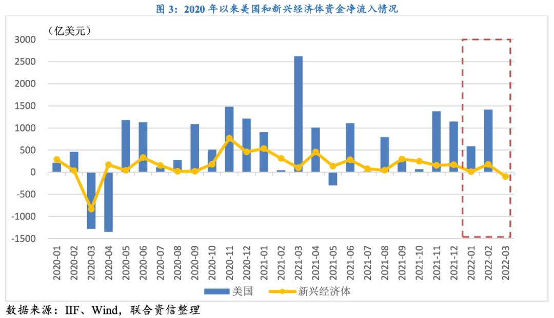 從資金流動情況看,自本輪美聯儲加息預期增強以來,2021年7月起流入美國股市和債市的資金規模呈現上升趨勢;進入2022年后,前兩個月凈流入美國的資金規模分別達到588.2億美元和1,417.3億美元,其中美國股市依舊呈現凈流出狀態,1月和2月凈流出規模分別為690.0億美元和105.7億美元,但流出規模明顯收窄;美國債市保持凈流入狀態,由1,278.2億美元(1月)上升至1,523.0億美元(2月),說明熱錢逐步回流美國時選擇相對安全的投資標的,美國債市因兼顧避險和投資屬性而受到投資者的青睞。在美聯儲3月第一次正式加息25個BP后,新興經濟體由資金流入轉為資金流出,凈流出新興經濟體的資金規模走高至98億美元,創新冠疫情暴發以來新高,其中凈流出新興經濟體股市的資金規模攀升至67億美元,創2021年7月以來新高;凈流出新興經濟體債市的資金規模上漲至31億美元,創2020年3月以來新高,熱錢撤離新興市場的趨勢較為顯著。