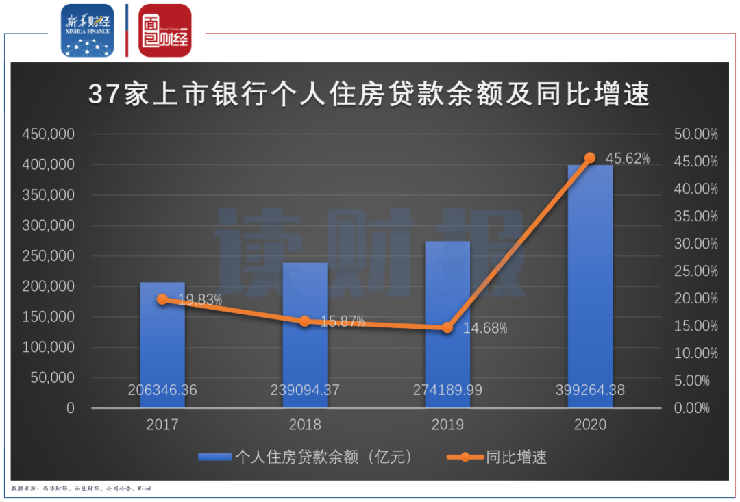 個(gè)人住房貸款方面,由于紫金銀行未詳細(xì)披露,除去該行以外,2020年37家上市銀行個(gè)人住房貸款余額達(dá)39.93萬億元,較上年末增加1.25萬億元,增幅達(dá)45.62%。