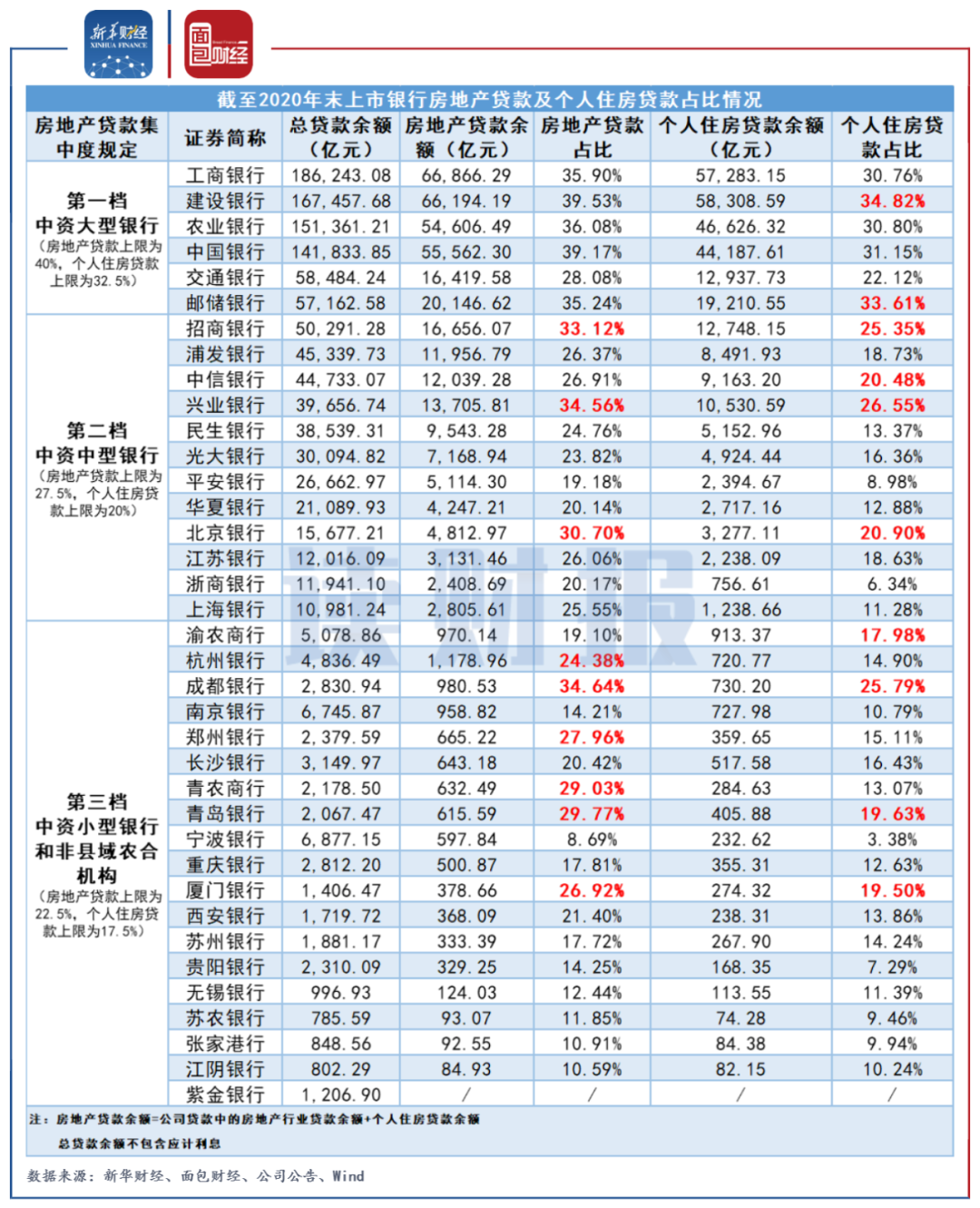 相關(guān)規(guī)定顯示,中資大型銀行(第一檔)、中資中型銀行(第二檔)、中資小型銀行和非縣域農(nóng)合機(jī)構(gòu)(第三檔)的房地產(chǎn)貸款占比上限分別為40%、27.5%和22.5%;個(gè)人住房貸款占比上限分別為32.5%、20%和17.5%。其中,中資大型銀行中的上市銀行為國(guó)有六大行;中資中型銀行中的上市銀行為股份制銀行以及北京銀行、上海銀行、江蘇銀行。中資小型銀行和非縣域農(nóng)合機(jī)構(gòu)中的上市銀行為不包括第二檔中的上市城商行及農(nóng)商行。