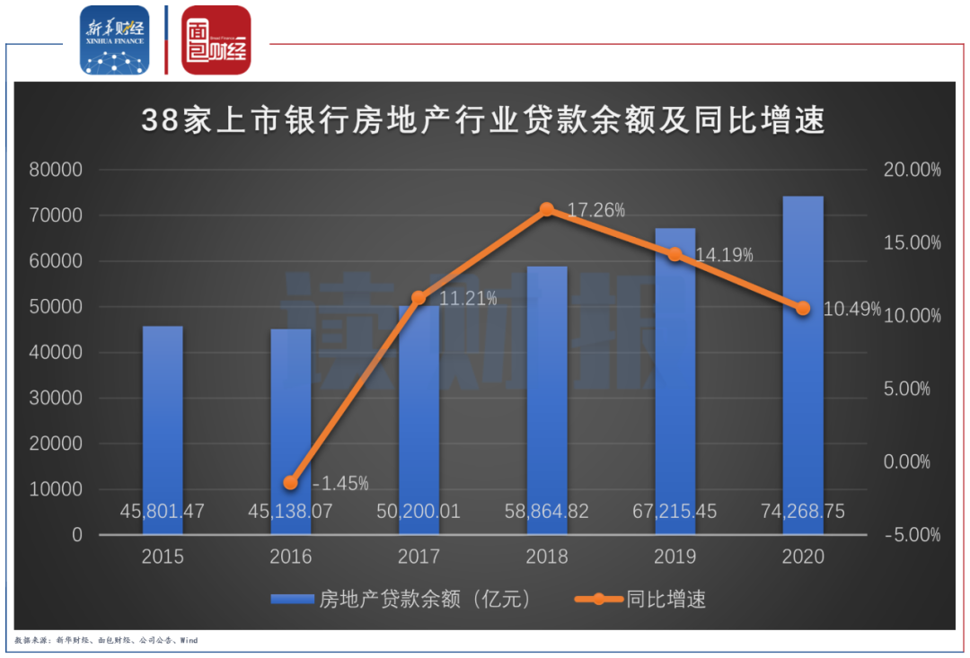 截至2020年末,38家上市銀行公司貸款中房地產(chǎn)行業(yè)貸款余額達(dá)7.43萬億元,較2019年末增加7053.3億元,增幅為10.49%。