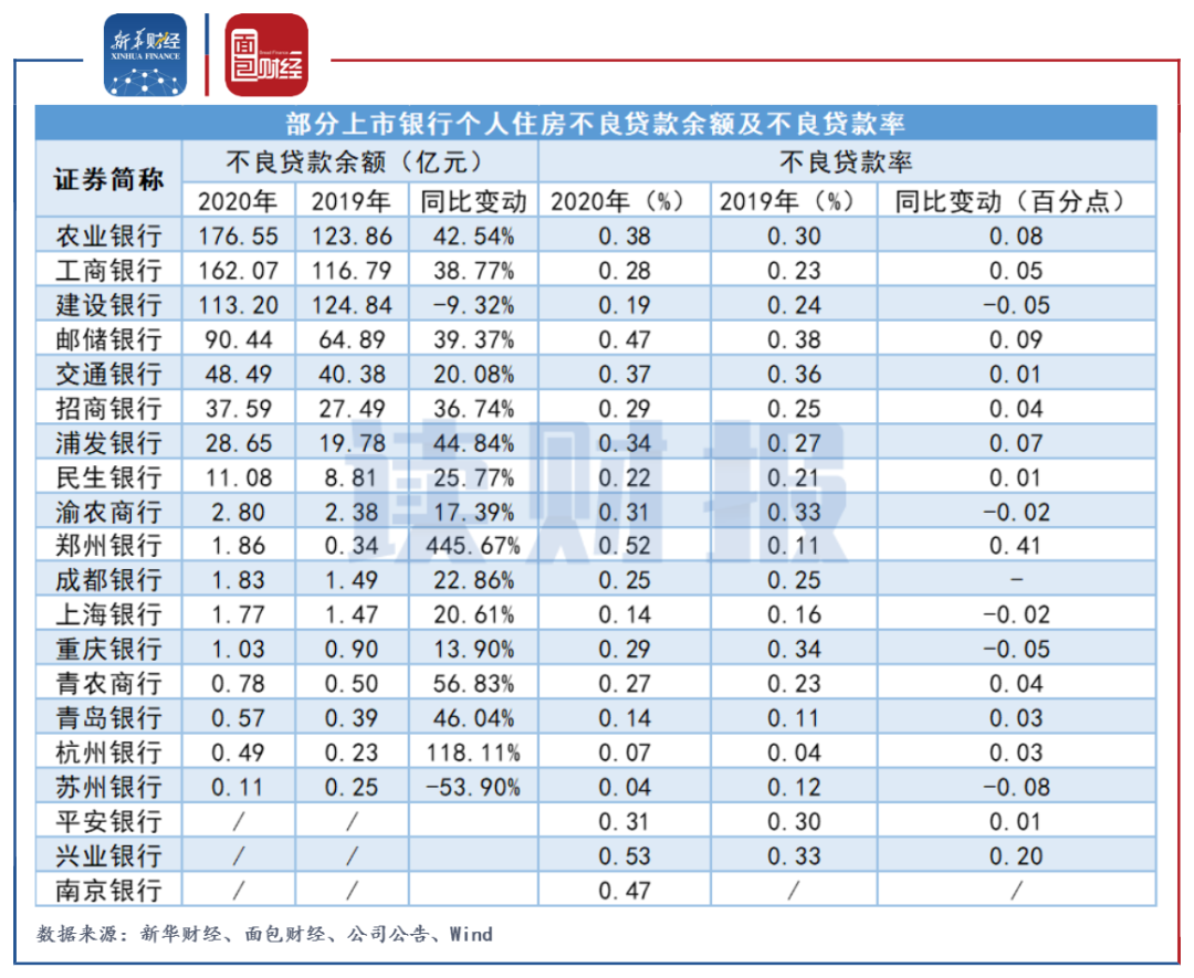 數(shù)據(jù)顯示,截至2020年末,個(gè)人住房不良貸款余額較多的仍是農(nóng)行,為176.55億元,其次是工行和建行,分別為162.07億元和113.2億元。城商行和農(nóng)商行的個(gè)人住房不良貸款余額整體偏少。與上年末相比,蘇州銀行和建行的不良貸余額出現(xiàn)下降,同比分別下降53.90%和9.32%。而鄭州銀行由于2019年基數(shù)較小,增幅超過4倍。