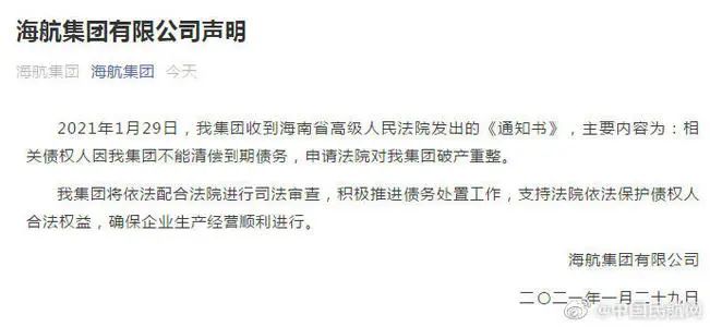 到現在為止,我們尚未找到法院受理海航破產申請的司法文書,所以海航并不算真正意義上的進入破產程序。