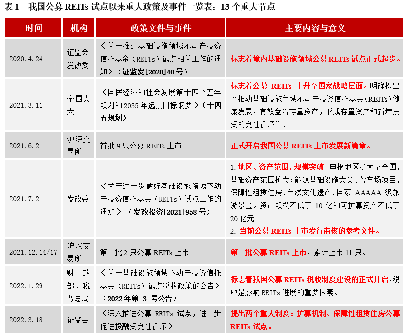 表1全面回顧和總結(jié)了我國(guó)公募REITs試點(diǎn)以來(lái)的13次重要進(jìn)展政策和事件: