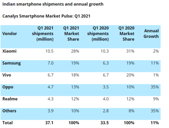 據(jù)Canalys數(shù)據(jù),按智能手機(jī)出貨量計(jì)算,小米一季度在全球62個(gè)國(guó)家和地區(qū)市占率排名前五,在全球12個(gè)地區(qū)的排名榜首。