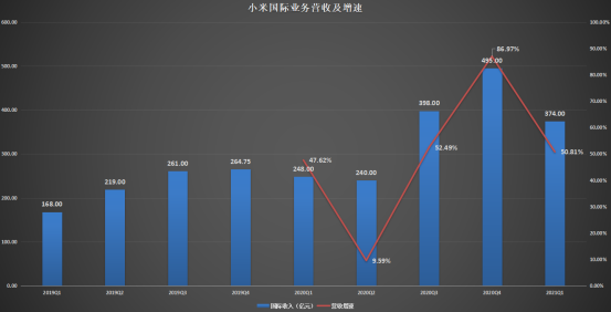 根據(jù)2021年Q1財(cái)報(bào),小米海外市場(chǎng)單季營(yíng)收達(dá)374億元,同比增長(zhǎng)50.6%,占公司總營(yíng)收的48.6%。