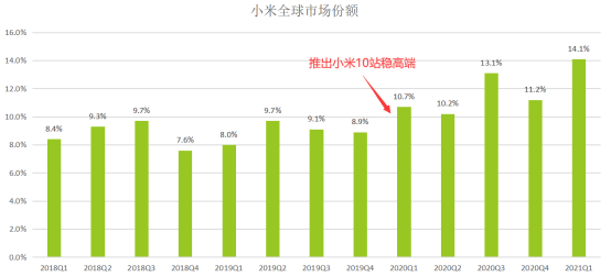 正是穩(wěn)扎穩(wěn)打的作風(fēng),讓其能夠在突然的疫情之下,依然有余力推出行業(yè)內(nèi)首款5G旗艦機(jī)型小米10,從而站穩(wěn)高端市場(chǎng)。根據(jù)IDC數(shù)據(jù),在2020Q1季度推出小米10后,小米全球市場(chǎng)份額突然增長(zhǎng),并由此開始不斷鯨吞其他廠家的份額。
