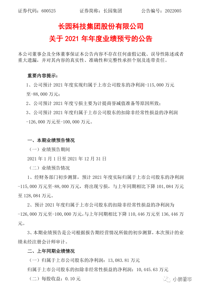 公告顯示,長園集團(tuán)預(yù)計2021年度虧損主要為計提商譽(yù)減值準(zhǔn)備等原因所致,其預(yù)計2021年度歸屬于上市公司股東的扣除非經(jīng)常性損益的凈利潤-12.6億元至-10億元。