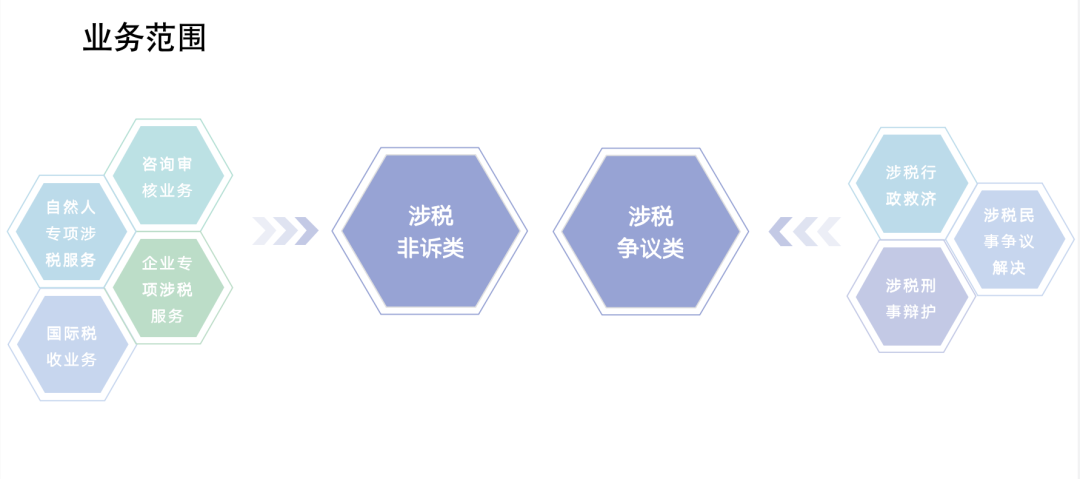 涉稅非訴業(yè)務(wù)主要涉及咨詢審核業(yè)務(wù),企業(yè)專項涉稅服務(wù)、自然人專項涉稅服務(wù)以及國際稅收業(yè)務(wù);涉稅爭議業(yè)務(wù)主要涉及涉稅行政救濟、刑事辯護以及民事涉稅爭議解決。