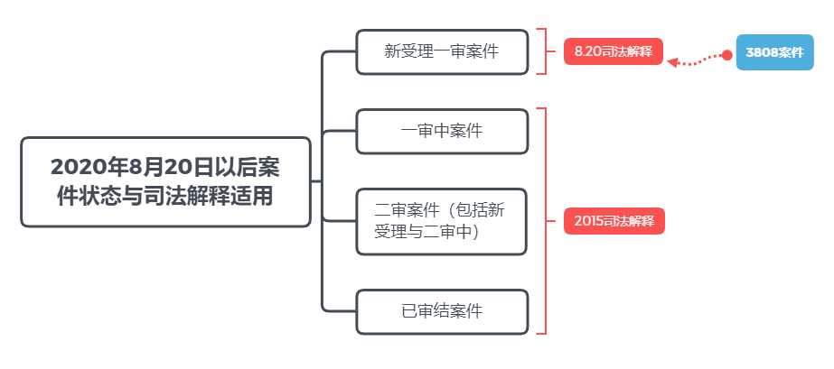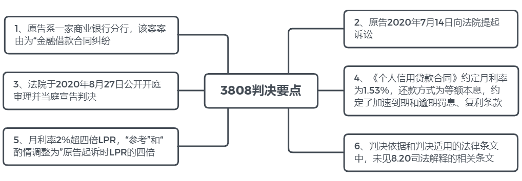 有觀點(diǎn)表示,8.20司法解釋第三十二條第二款規(guī)定:“借貸行為發(fā)生在2019年8月20日以前的,可參考原告起訴時(shí)一年期貸款市場報(bào)價(jià)利率四倍確定受保護(hù)的利率上限”,該款似乎可以作為3808案件作出“參照”判決的依據(jù)。