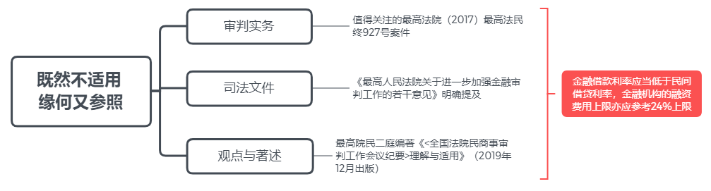 這里首先需要關(guān)注的是,對金融機(jī)構(gòu)的排除適用情形是有所限縮的,即僅限于具有發(fā)放貸款業(yè)務(wù)資質(zhì)的金融機(jī)構(gòu)且貸款類型僅限于經(jīng)營性的貸款業(yè)務(wù)。但即便如此,仍然囊括了絕大部分的金融機(jī)構(gòu)貸款業(yè)務(wù)。回歸核心問題:既然不適用,緣何又參照?