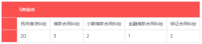 2. 包括5類案由:民間借貸糾紛(占絕對多數(shù))、借款合同糾紛、小額借款合同糾紛、金融借款合同糾紛、保證合同糾紛。