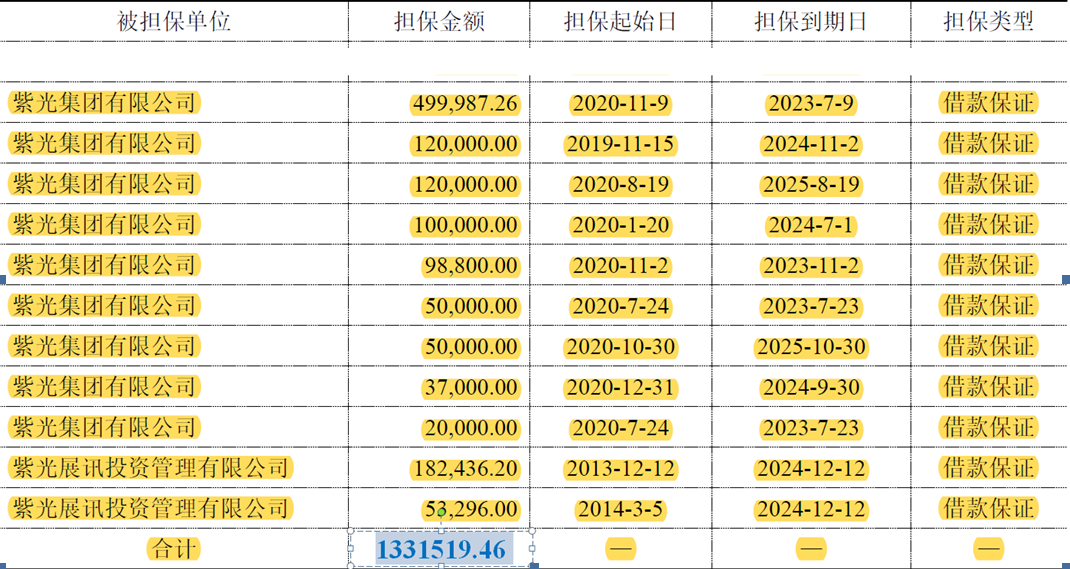第一,對紫光集團(tuán)及其下屬紫光展訊投資管理有限公司(以下稱“紫光展訊”)的長期借款提供的無限連帶責(zé)任擔(dān)保,總擔(dān)保金額133.1519億元。其中對紫光集團(tuán)本級的擔(dān)保金額109.58億元,全部發(fā)生在2019年11月-2020年11月期間。