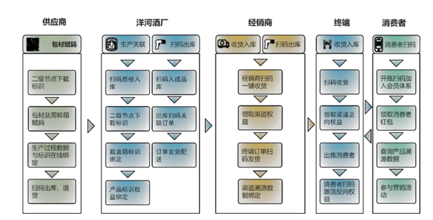比如,通過瓶箱關(guān)聯(lián)體系,在包裝箱和產(chǎn)品上附著二維碼,當(dāng)經(jīng)銷商和終端網(wǎng)點收貨時均需掃碼。可極大地杜絕制假、造假和區(qū)域竄貨,以及擾亂市場價格秩序的亂價問題。