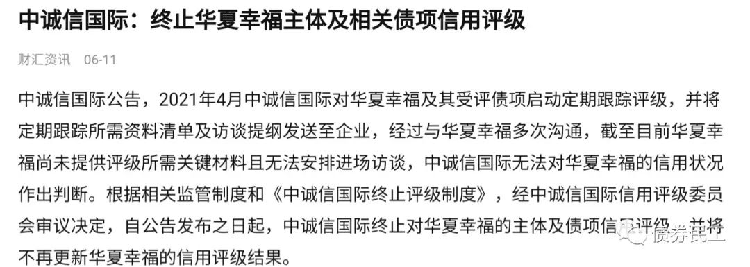 根據財匯資訊2021年6月11日的報道,因華夏幸福尚未提供評級所需要的關鍵材料且無法安排進場訪談,中誠信決定終止對華夏幸福的主體及債項評級。