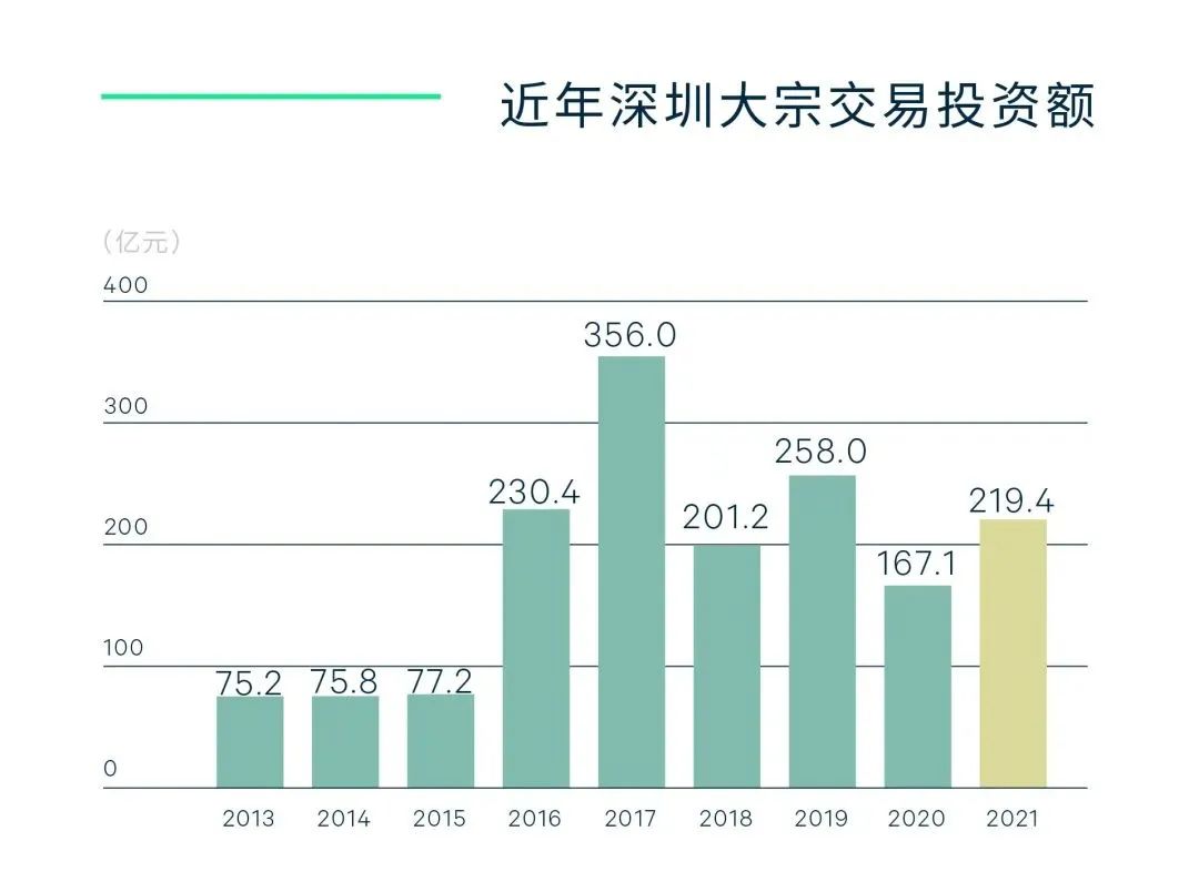 據世邦魏理仕數據顯示,2021年深圳大宗交易市場全年共錄得23宗交易,整體成交金額共計219.4億元,同比上升31.0%。