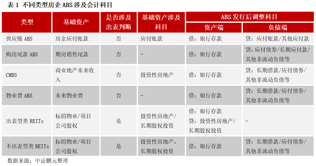 根據(jù)基礎(chǔ)資產(chǎn)的不同,房地產(chǎn)ABS可細(xì)分為供應(yīng)鏈ABS、購房尾款A(yù)BS、物業(yè)費(fèi)ABS、CMBS、類REITs和其他。不同類型的ABS在賬務(wù)處理上有所差異,其中,供應(yīng)鏈ABS僅涉及負(fù)債端科目內(nèi)的調(diào)整;物業(yè)費(fèi)ABS、CMBS及購房尾款A(yù)BS可看作有抵押的債務(wù)融資,對應(yīng)增加銀行存款及負(fù)債;類REITs為房企ABS中唯一涉及到出表判斷的種類,不出表型類REITs則新增一項(xiàng)負(fù)債。